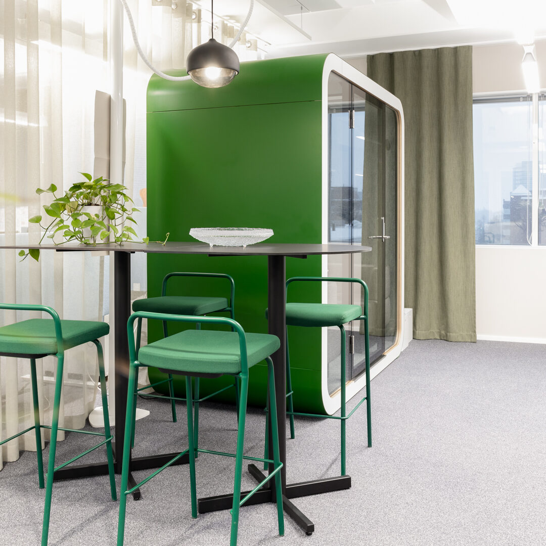 Tilasuunnittelu yhdistää hiljaiset työpisteet, yhteistyöalueet ja joustavat kohtaamispaikat. Näin jokainen työntekijä löytää paikan, joka tukee omaa tapaa työskennellä – ilman että tila tuntuu levottomalta.