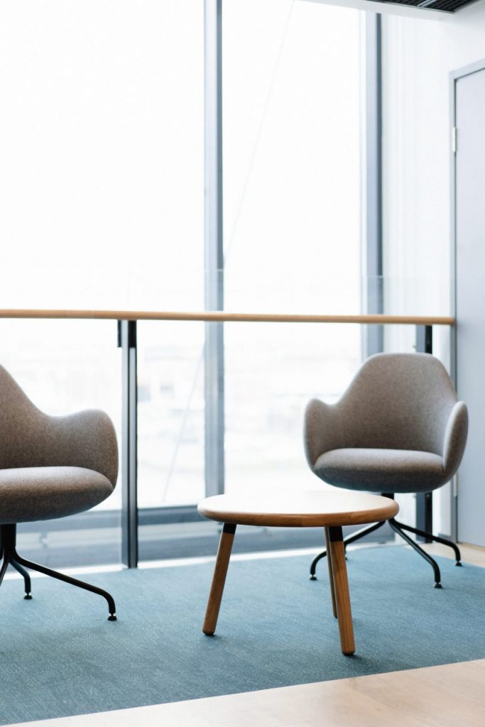 Jos yrityksellä on sinistä brändiväreissään, sitä voi tuoda sisustukseen hienovaraisesti esimerkiksi tekstiileissä, kalusteiden verhoiluissa. Näin toimiston sisustus tukee visuaalisesti yrityksen identiteettiä ja tekee tilasta tunnistettavan.
